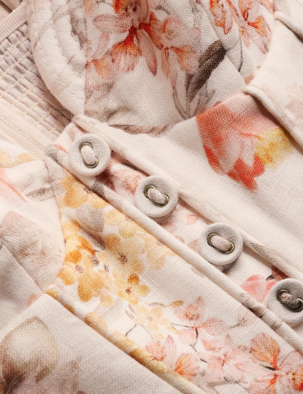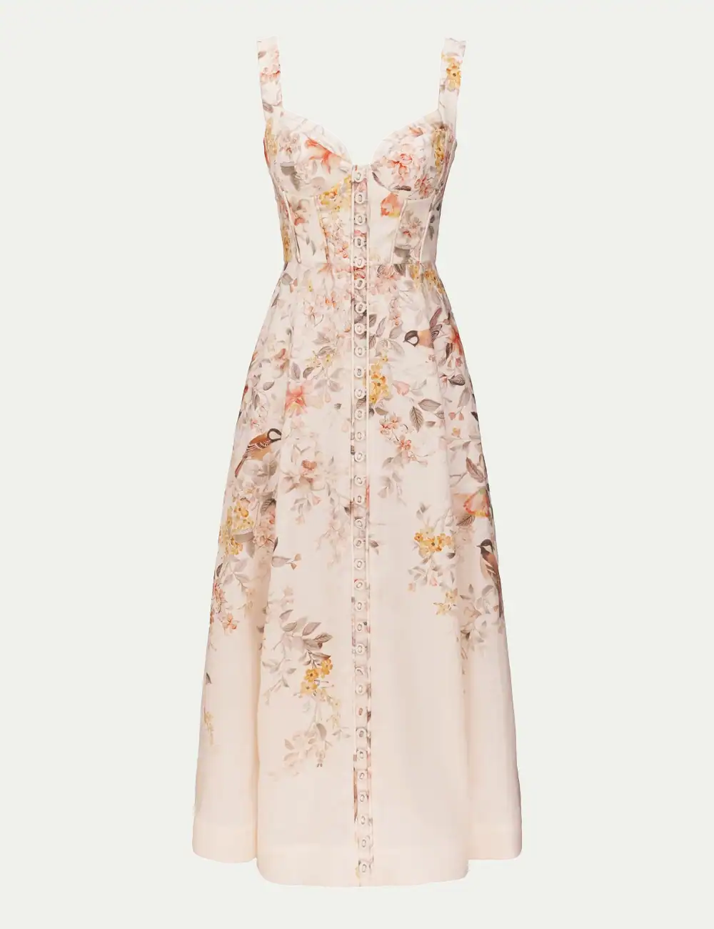 The Luna Ruffle Midi Dress in Cream Dahlia from our Spring 2026 Collection, Kindred Spirit. A silk-linen blend midi dress featuring a sweetheart neckline, fitted bodice, rouleau self-tie straps, finished with a full flare skirt and soft fluff trim.