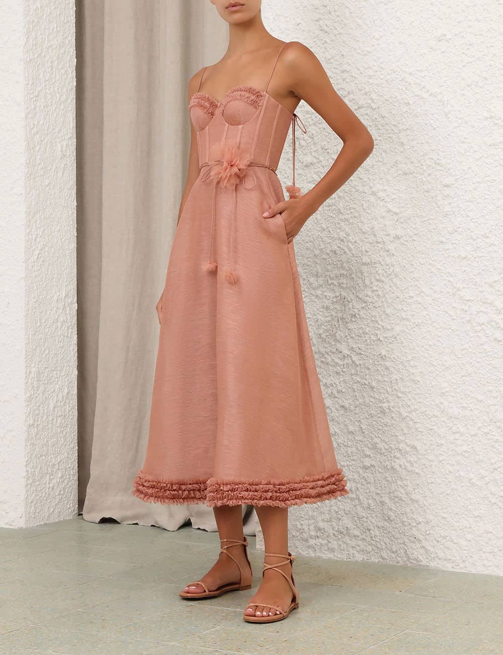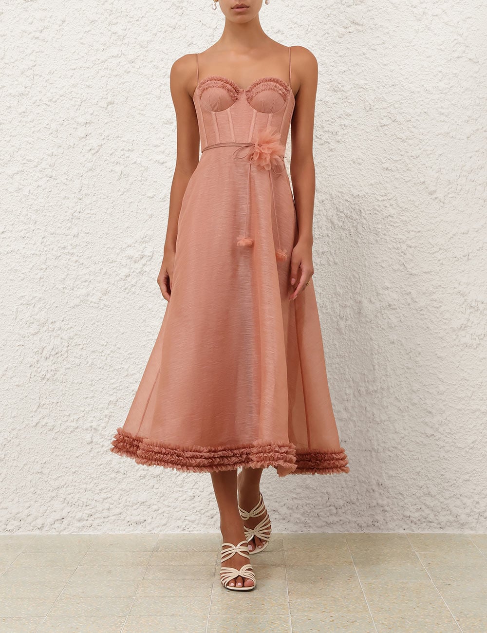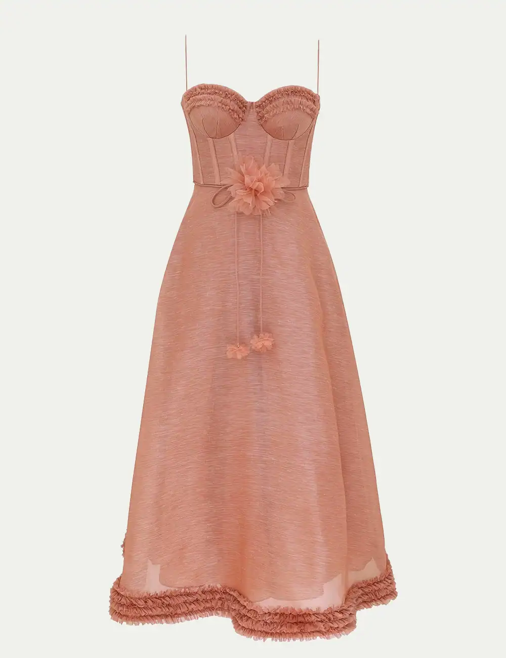 The Luna Ruffle Midi Dress in Cream Dahlia from our Spring 2026 Collection, Kindred Spirit. A silk-linen blend midi dress featuring a sweetheart neckline, fitted bodice, rouleau self-tie straps, finished with a full flare skirt and soft fluff trim.