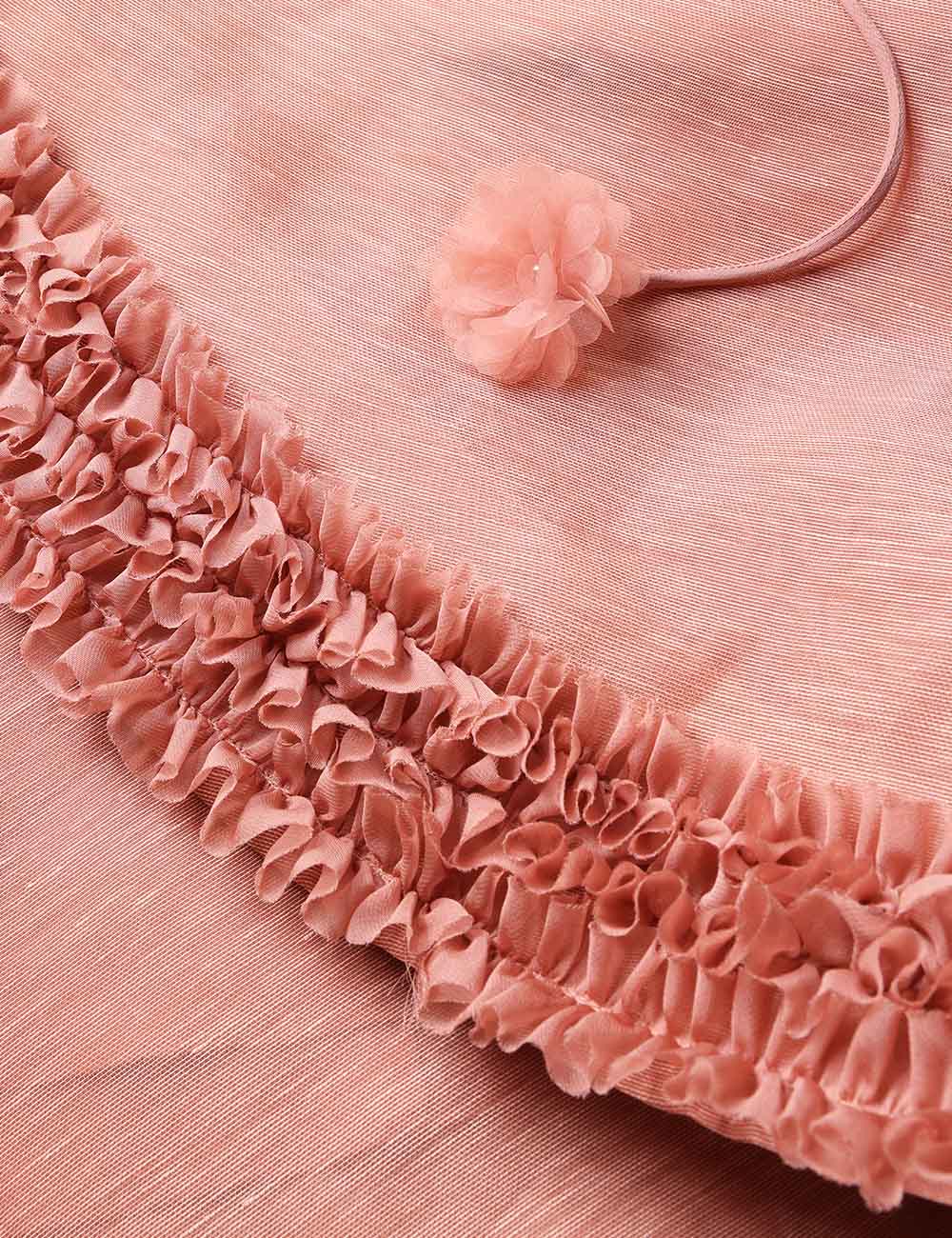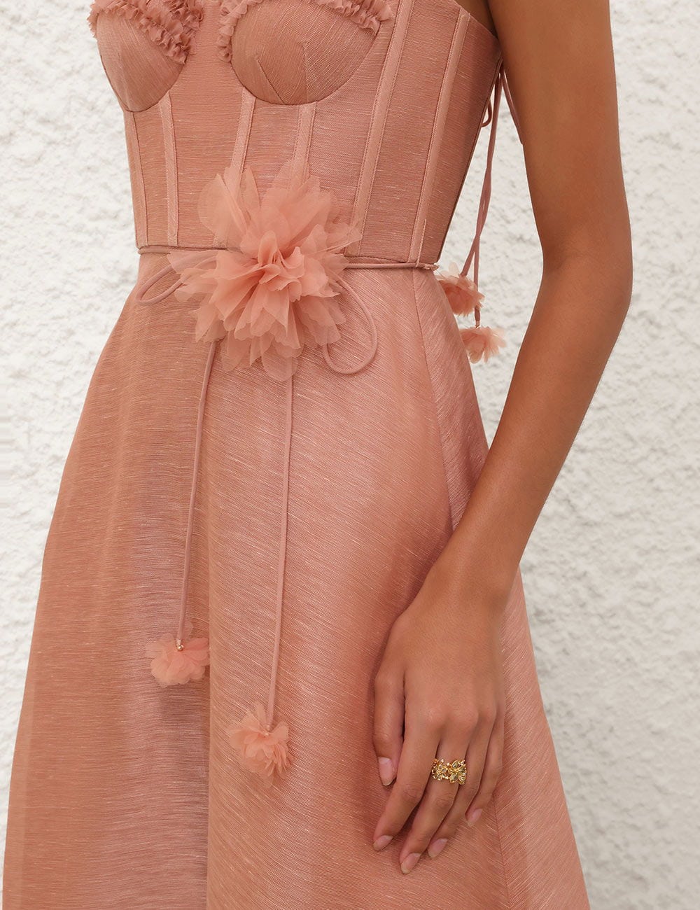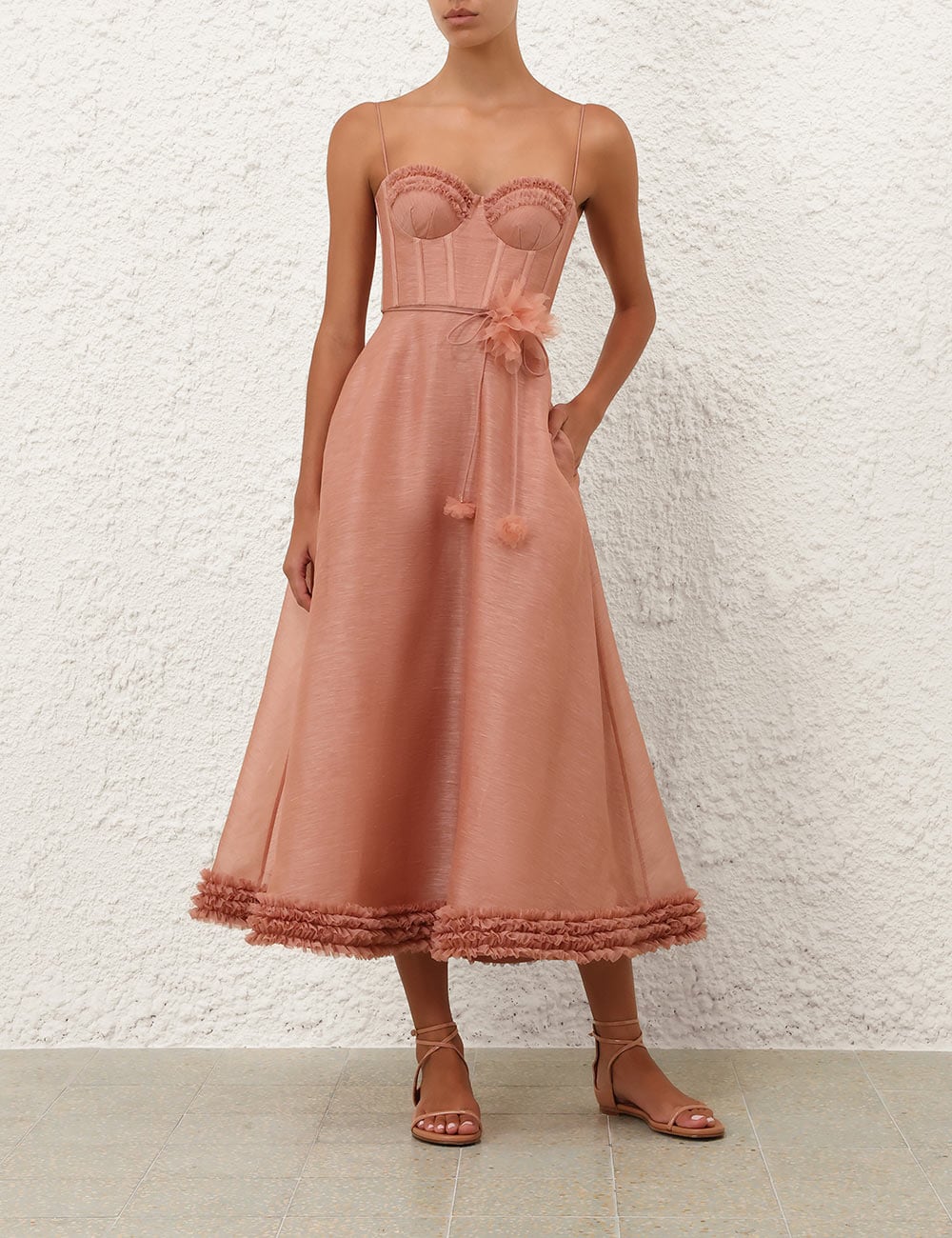 The Luna Ruffle Midi Dress in Cream Dahlia from our Spring 2026 Collection, Kindred Spirit. A silk-linen blend midi dress featuring a sweetheart neckline, fitted bodice, rouleau self-tie straps, finished with a full flare skirt and soft fluff trim.