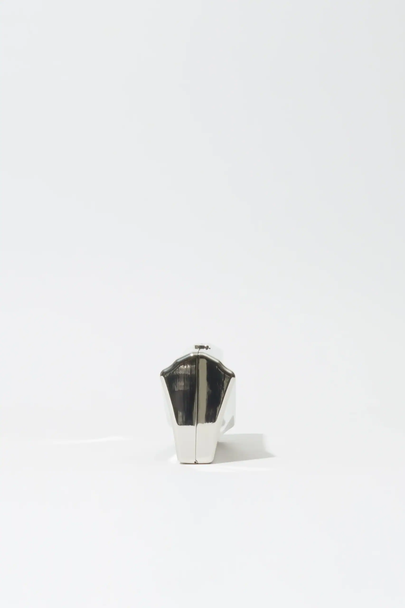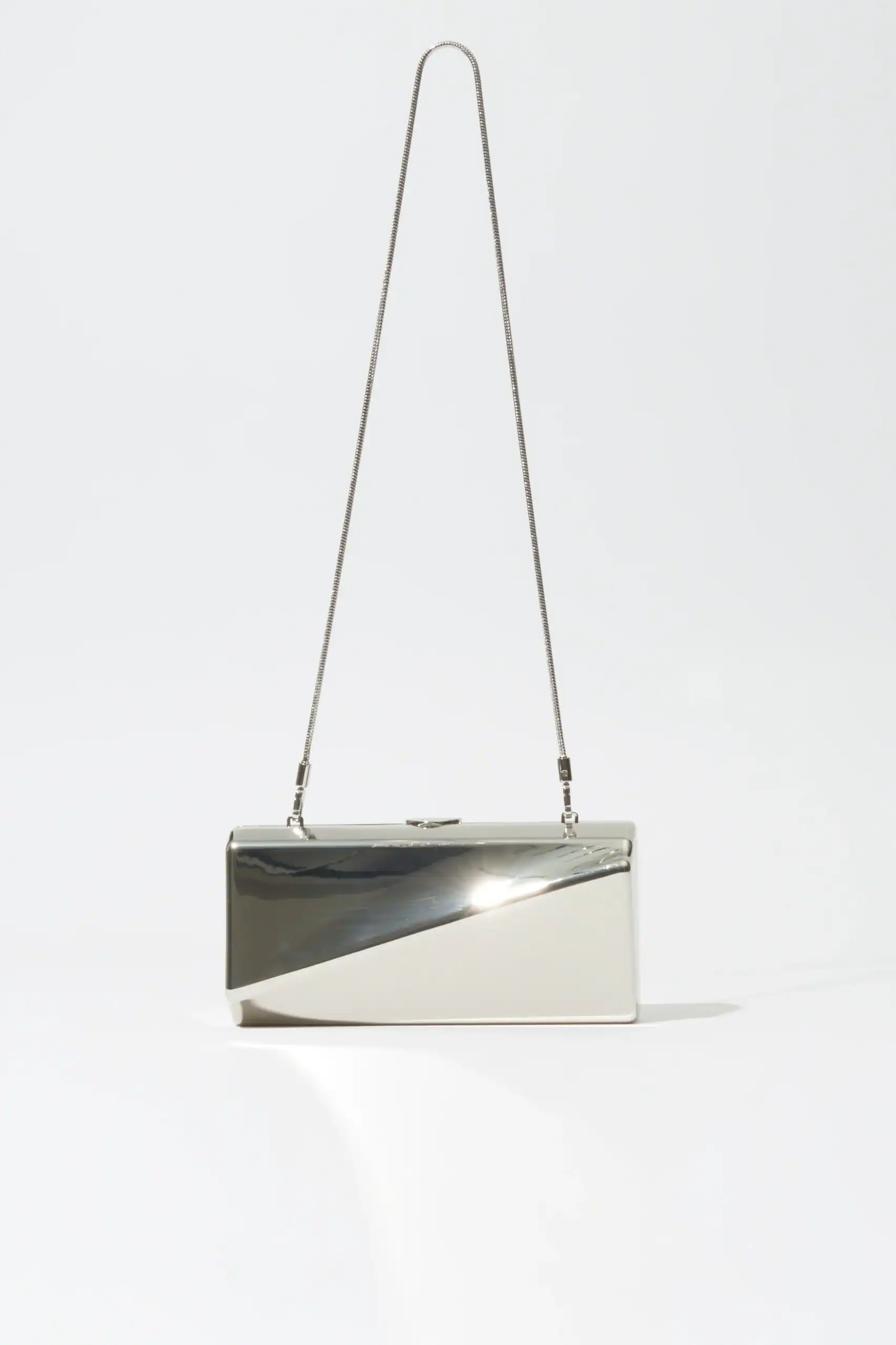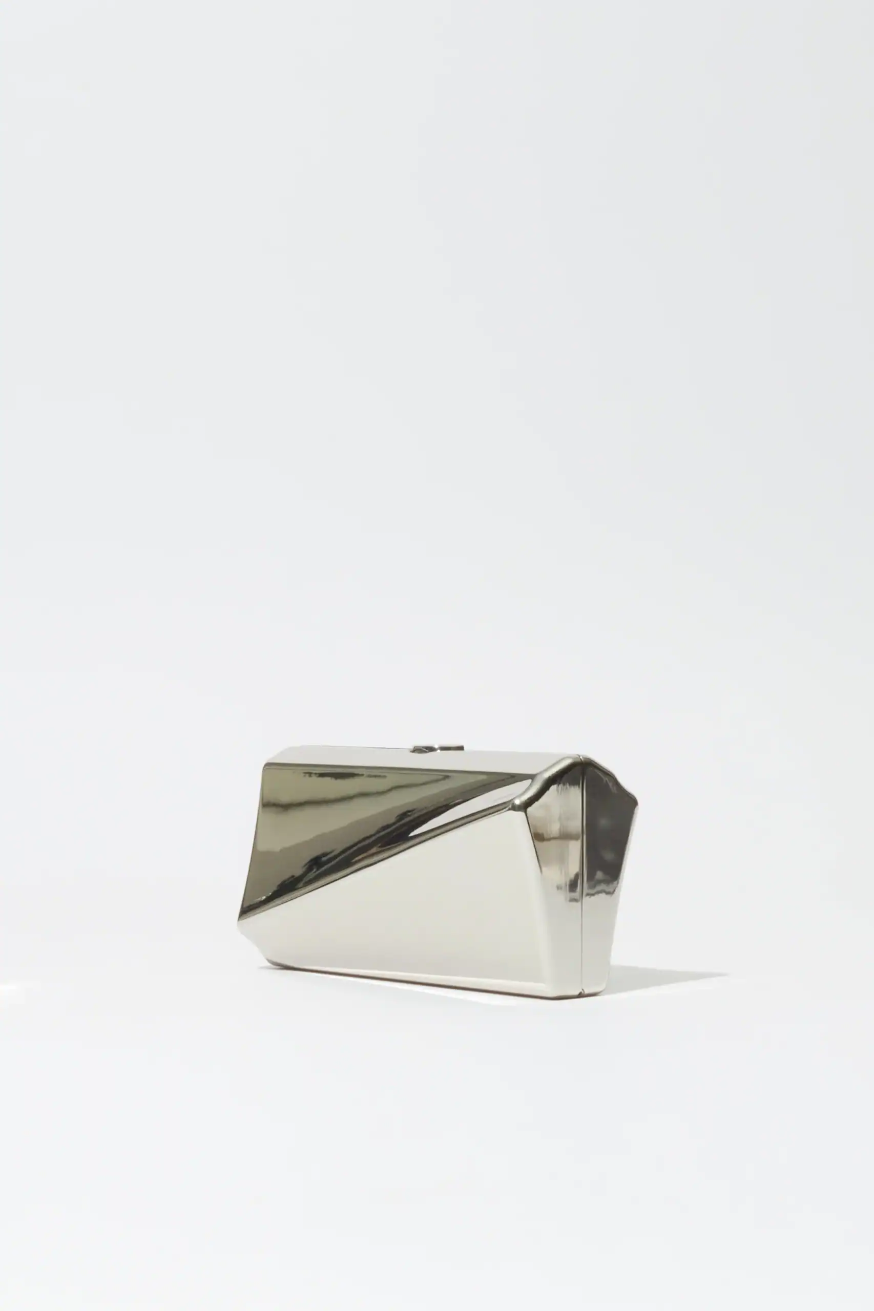 Crafted from sleek metal, this clutch is defined by its clean lines and angular contours. The geometric silhouette and detachable strap lend both edge and elegance. Designed to stand out through simplicity and structure.