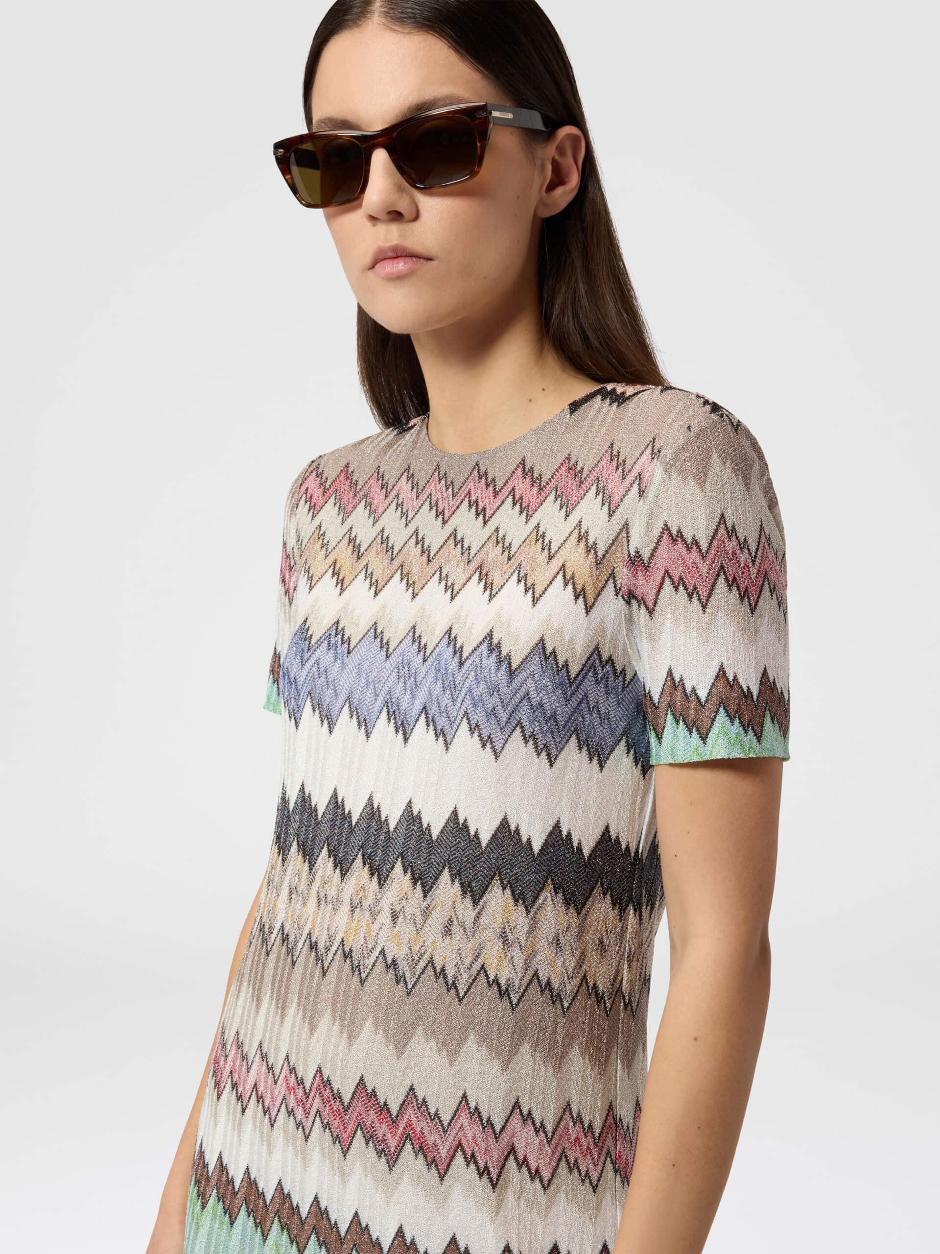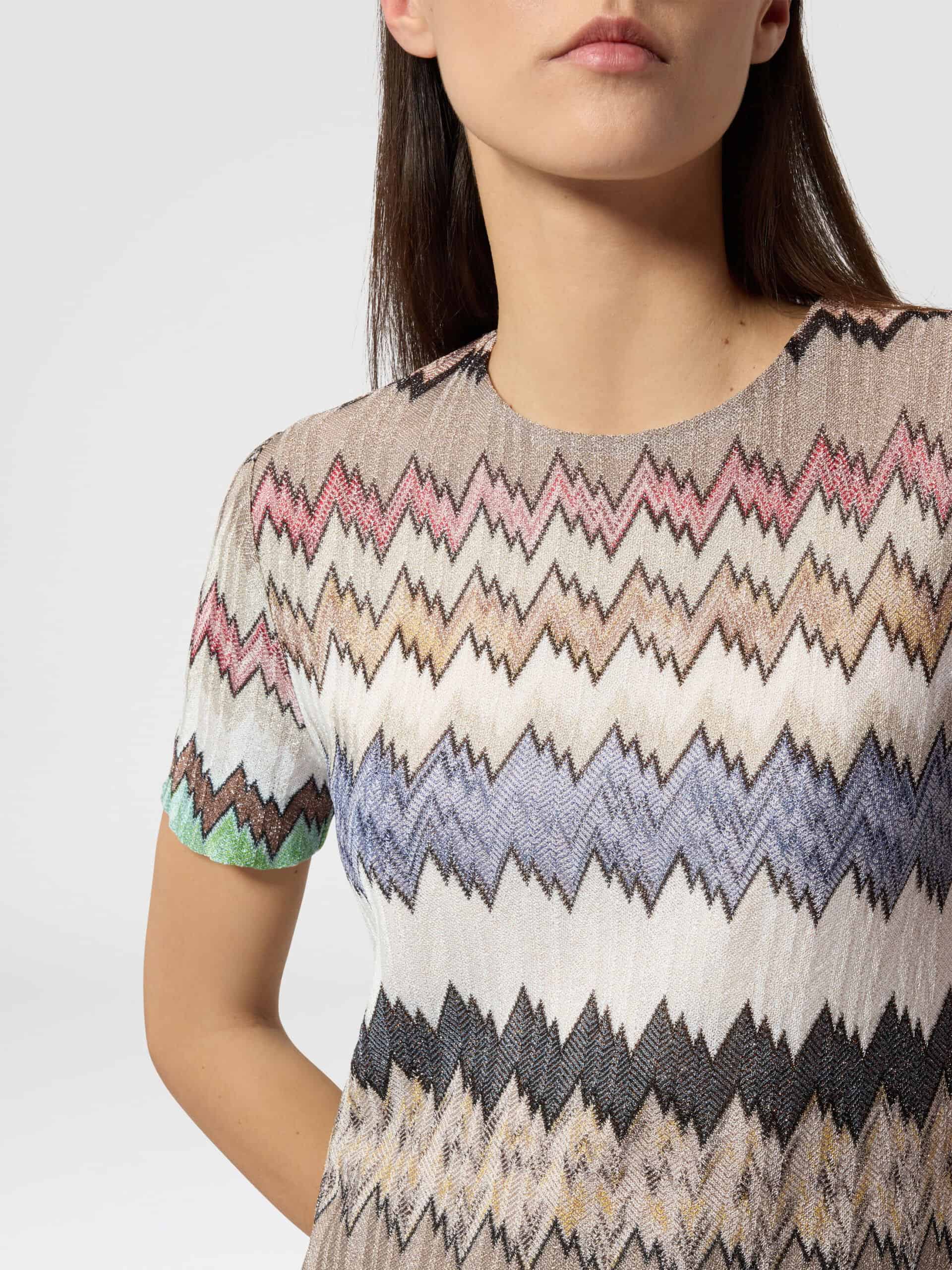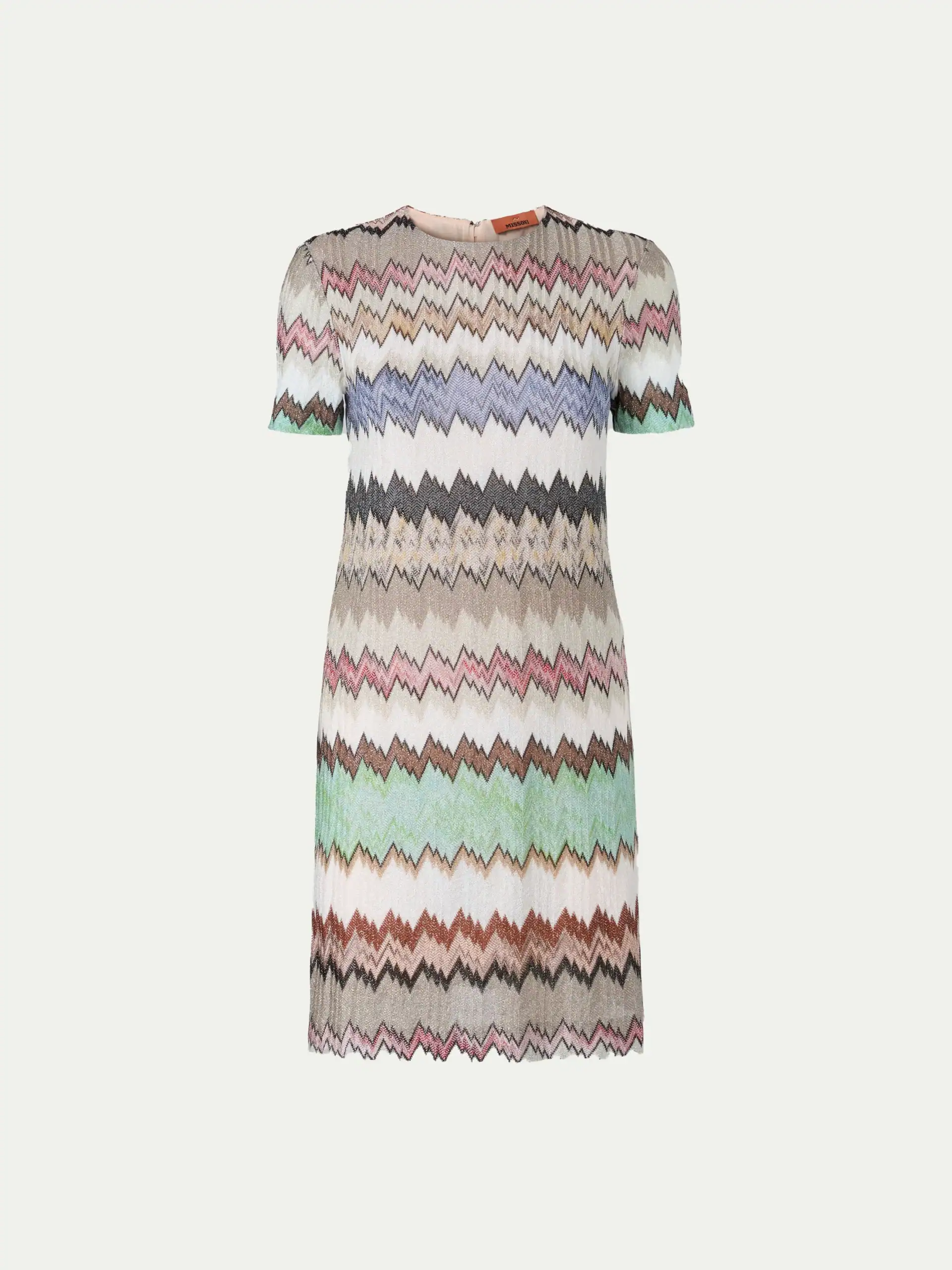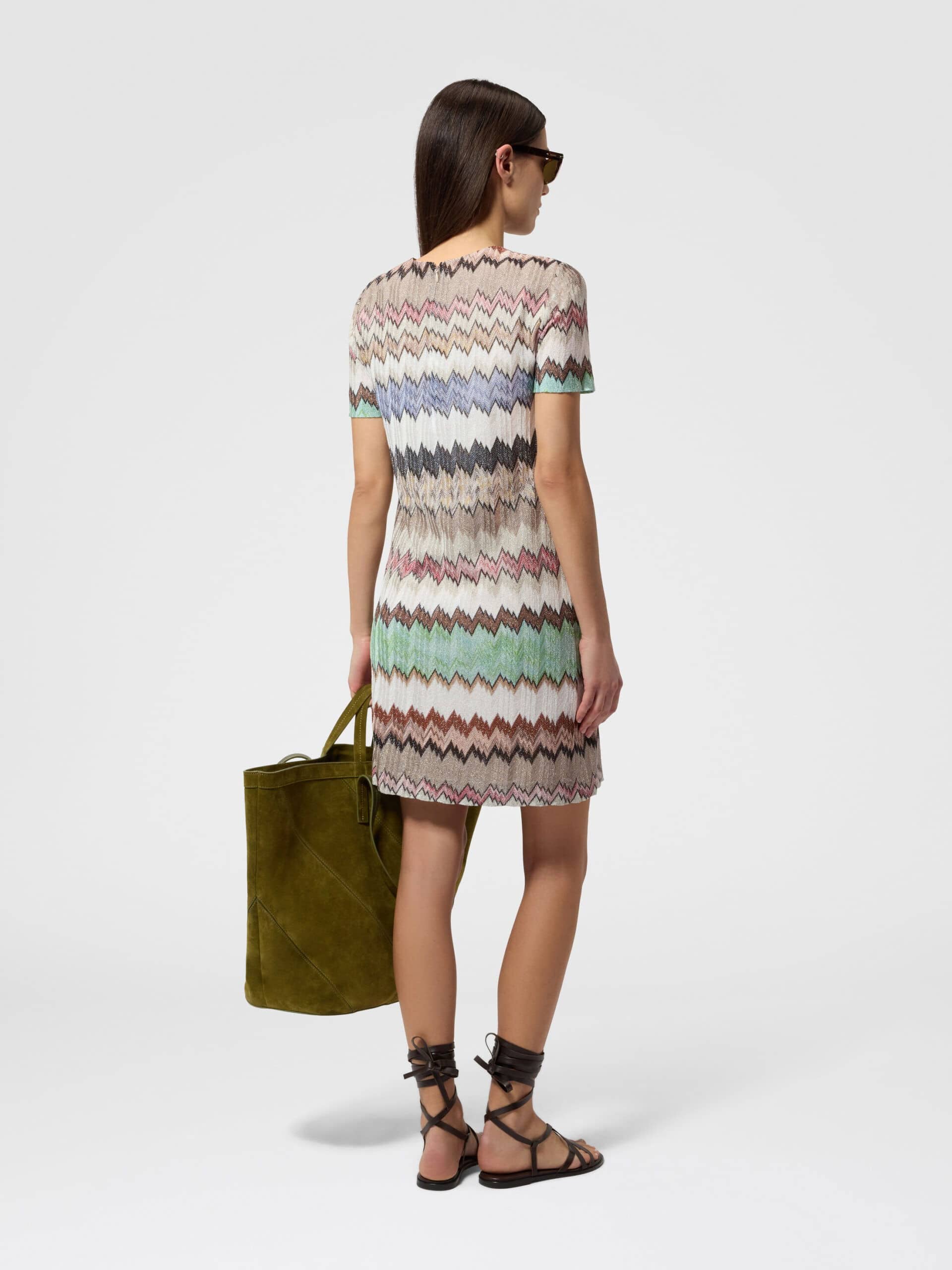 Women’s mini dress in viscose lamé with short sleeves, enhanced by a raschel workmanship featuring an irregular snake motif. The luminous shades and play of textures reinterpret Missoni’s distinctive style with originality.